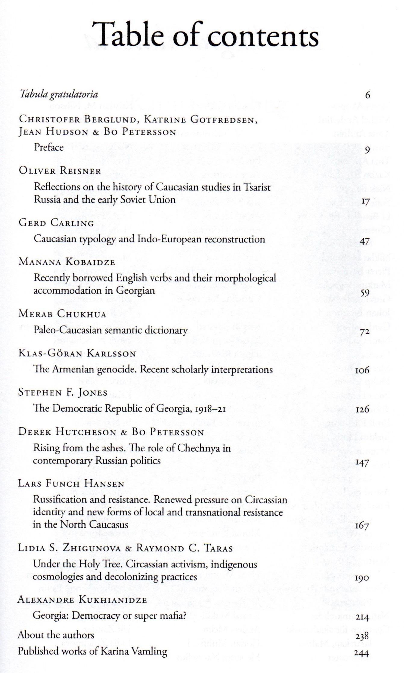 My warmest thanks to the authors Oliver Reisner, Gerd Carling, Manana Kobaidze, Merab Chukhua, Klas-Göran Karlsson, Stephen F. Jones, Derek Hutcheson, Bo Petersson, Lars Funch Hansen, Lidia S. Zhigunova, Raymond Taras, Alexandre Kukhianidze. Thank you all who joined in at the seminar – from the Caucasus to the US – for the many memorable words. So happy to see all friends and colleagues in the Tabula gratulatoria!