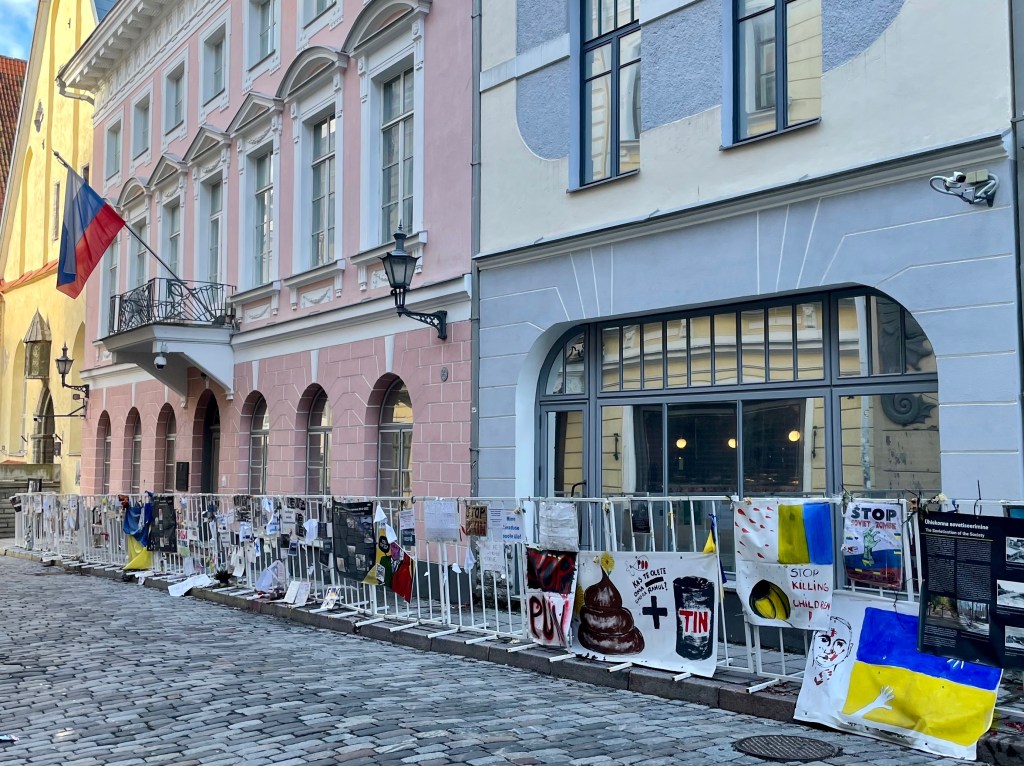 On the same street, opposite the Embassy of Sweden, is the Russian embassy – with a long line of Ukainian flags and banners in front of it (photos below, lower line).