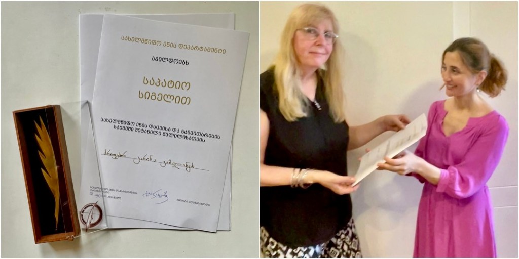 In April, it was an exceptional honor for me to receive an award from Caucasus University in Tbilisi for my contributions to the study of the Georgian language. The festive ceremony took place on April 15. The prize – a beautiful bronze tree with leaves of Georgian letters – was awarded by Rector Kakhaber Shengelia. I’m most grateful for this recognition of my work. The event was attended by the Ambassador of Sweden to Georgia, H.E. Anna Lyberg. My special thanks to Professor Mariam Manjgaladze, who was the initiator and organizer of the impressive event on the occasion of the Day of the Georgian Language.
