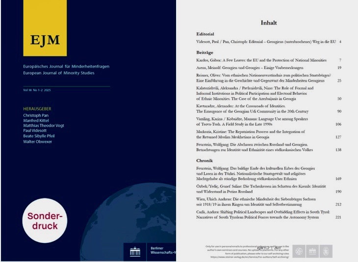 The special issue on Georgia of the European Journal of Minority Studies has appeared. My contribution together with Manana Kobaidze is entitled “Language Use among speakers of Tsova-Tush. A field study in the late 1990s.” Many thanks to the editors for a fruitful collaboration. https://biblioscout.net/journal/ejm/18/1-2