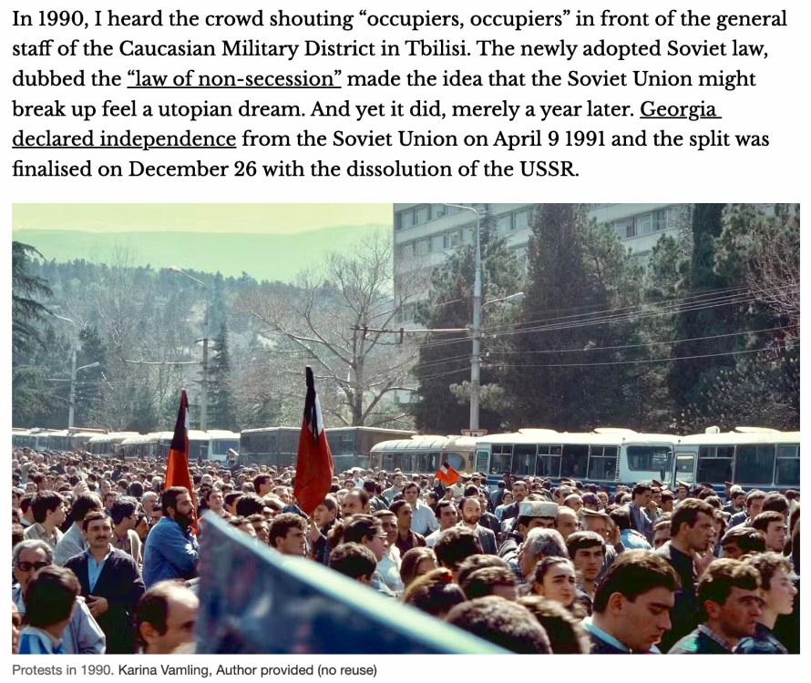 In 1990, I heard the crowd shouting “occupiers, occupiers” in front of the general staff of the Caucasian Military District in Tbilisi. The newly adopted Soviet law, dubbed the “law of non-secession” made the idea that the Soviet Union might break up feel a utopian dream. And yet it did, merely a year later. Georgia declared independence from the Soviet Union on April 9 1991 and the split was finalised on December 26 with the dissolution of the USSR. (Karina Vamling, The Conversation, April 10, 2026)