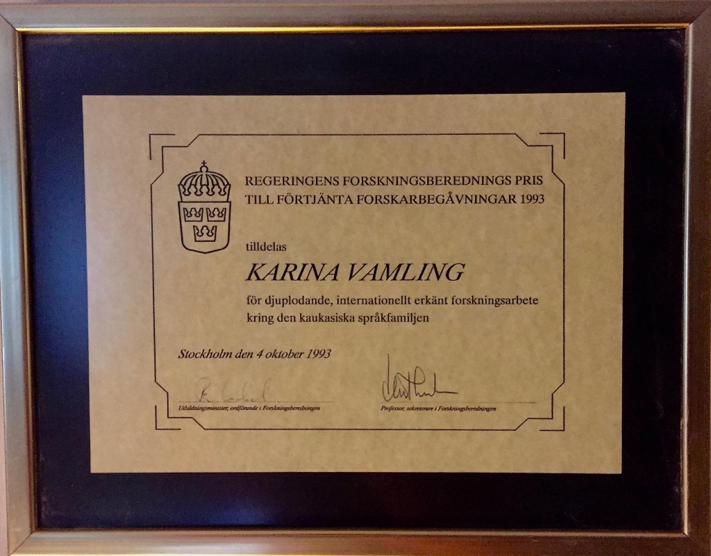 The Swedish Government’s Research Committee Prize to Merited Young Researchers (October 4, 1993), awarded for “profound and internationally recognized research on the Caucasian languages” – ”för djuplodande, internationellt erkänt orskningsarbete kring den kaukasiska språkfamiljen”.