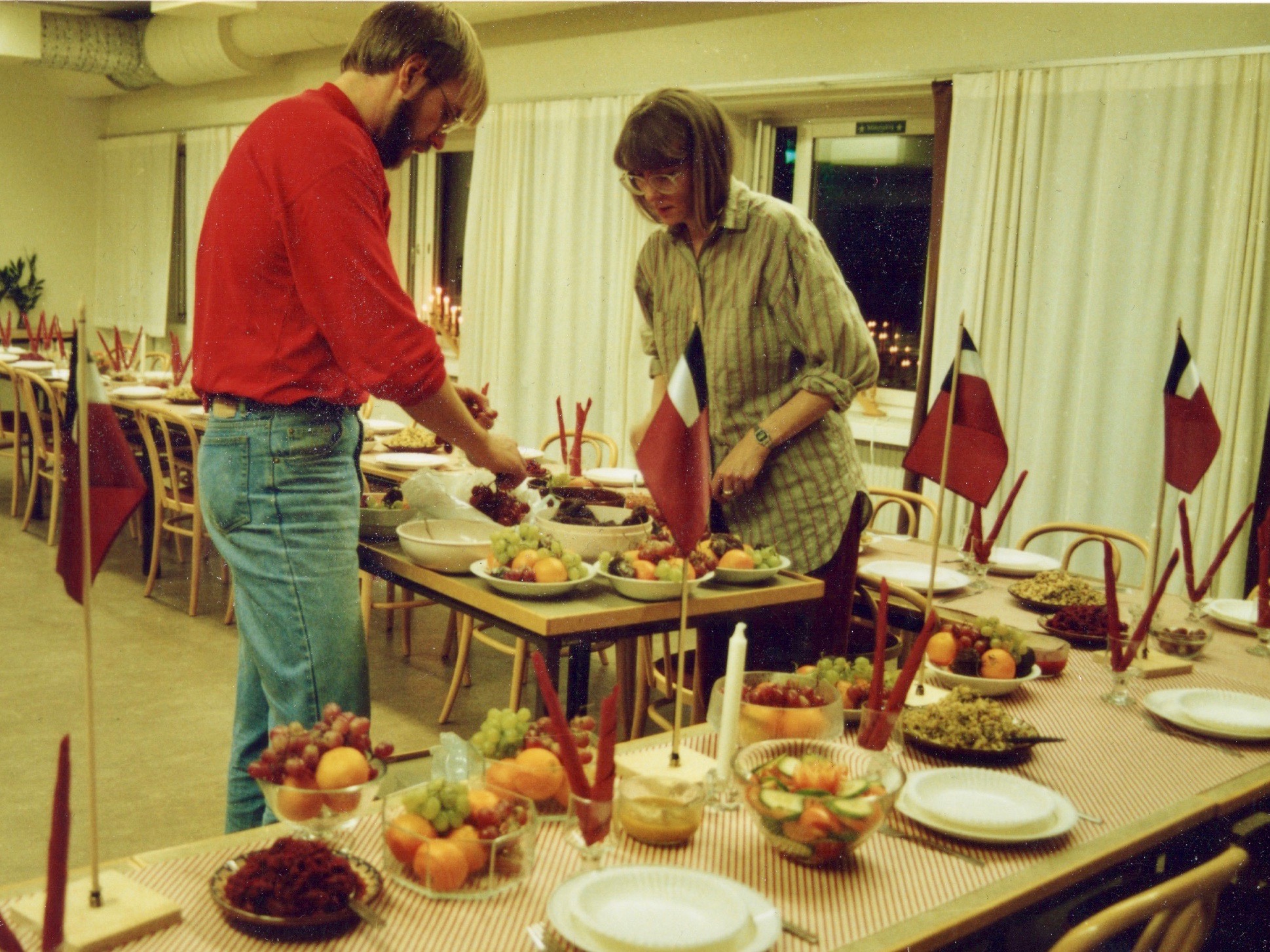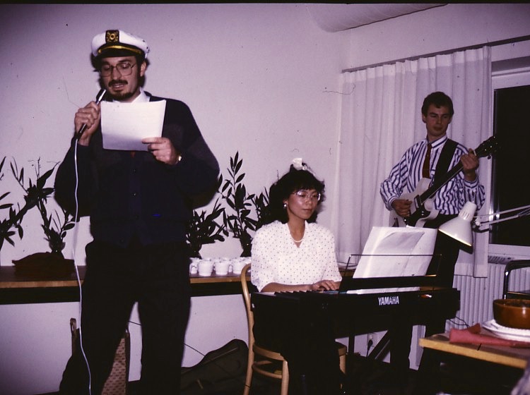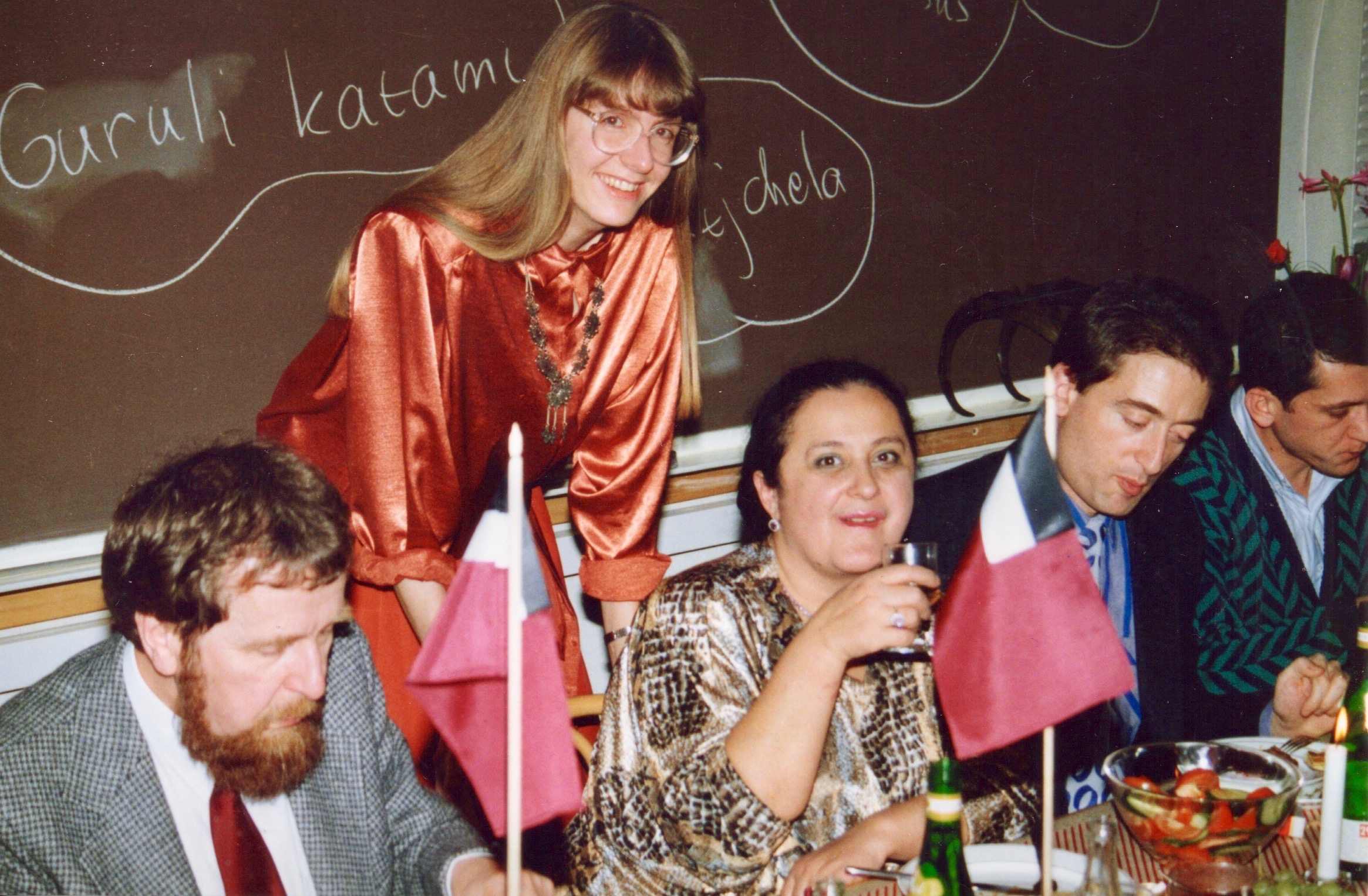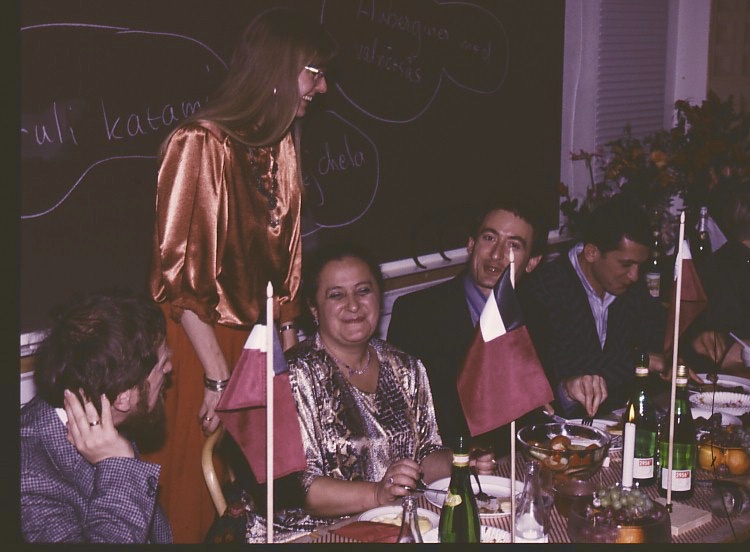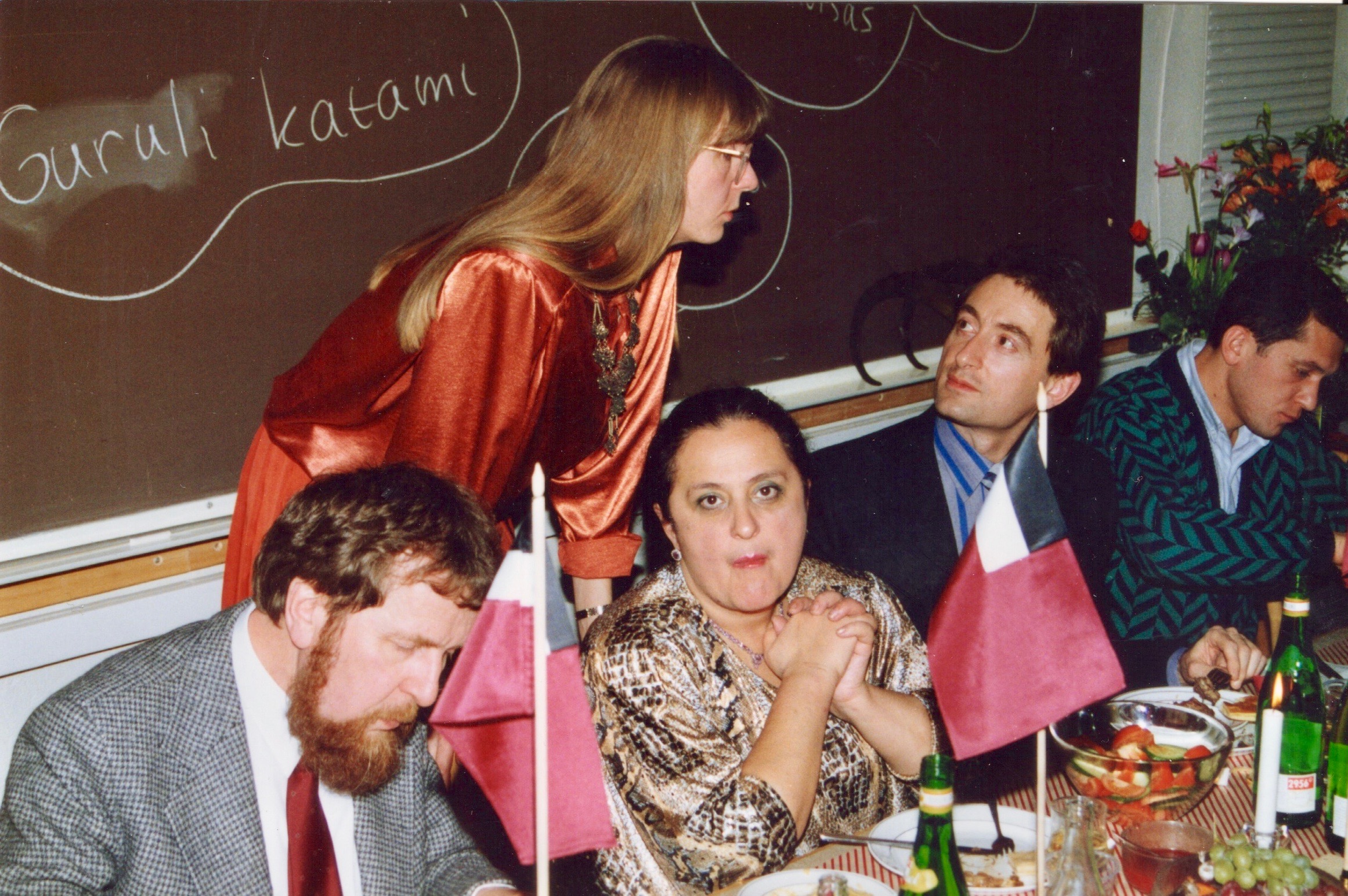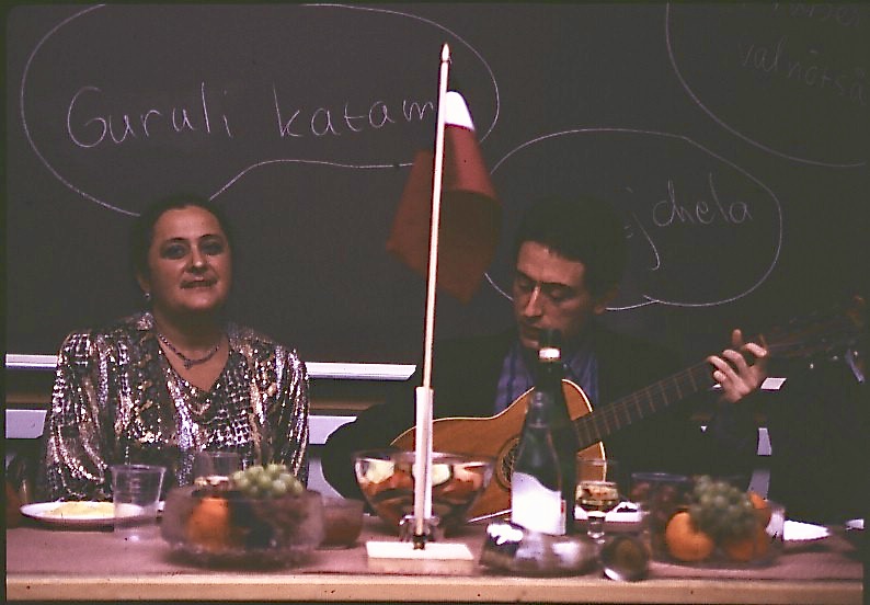 As this was long before smart phone days, no video recording remains. Some photos were made during the performance of the band Stämbandet, of Irakli K. playing the guitar and from the dissertation supra with guruli katami, ghomi, badridzhani nigvzit (thanks to Nani), churchkhela… The tables were decorated with flags of independent Georgia (made by my mother for the occasion), something that was quite unusual in 1989, as this was still during Soviet times.