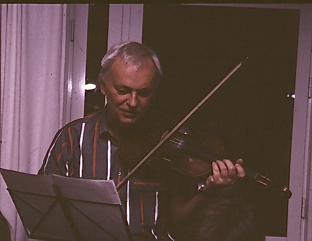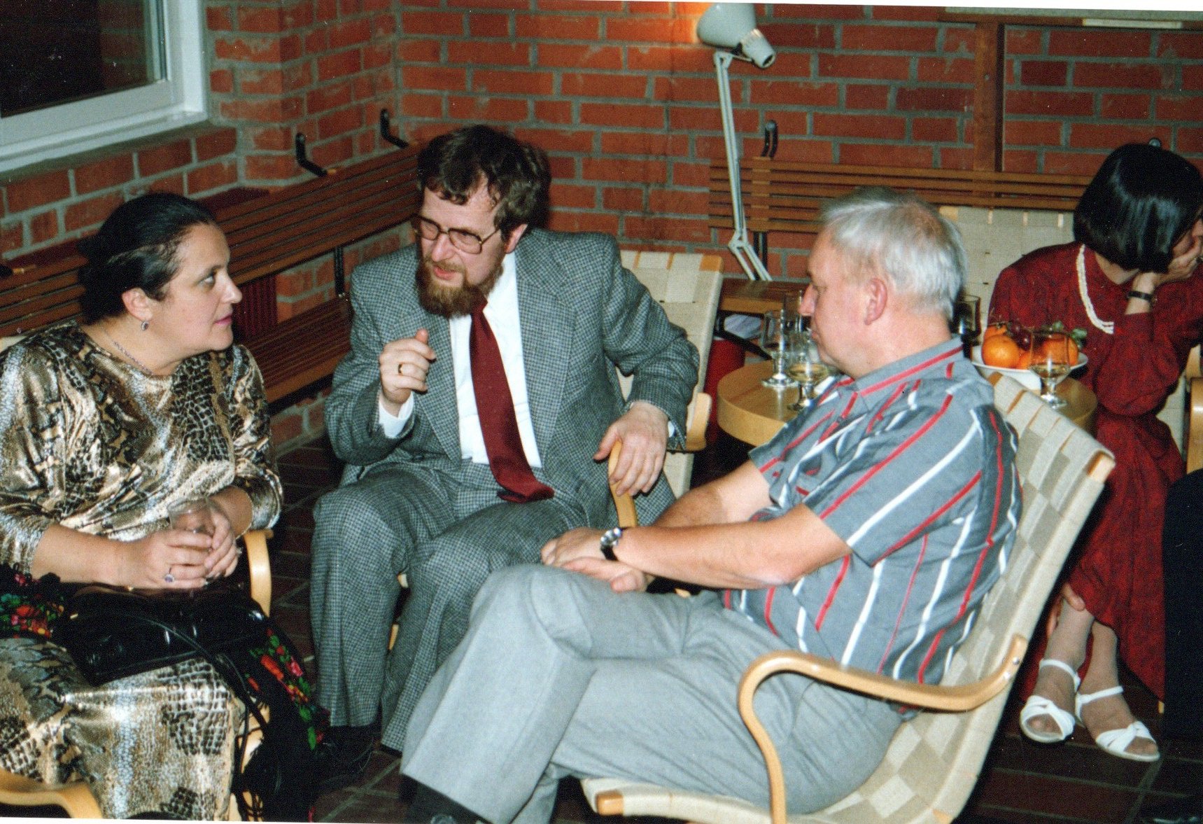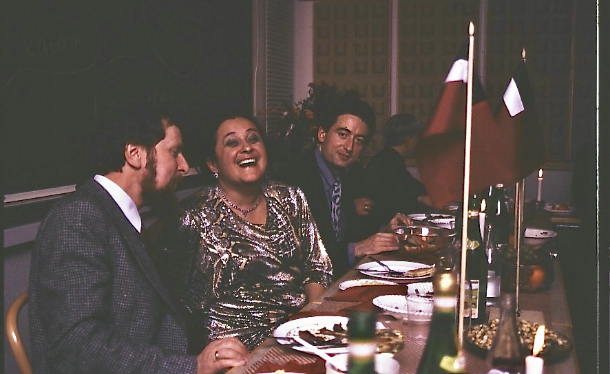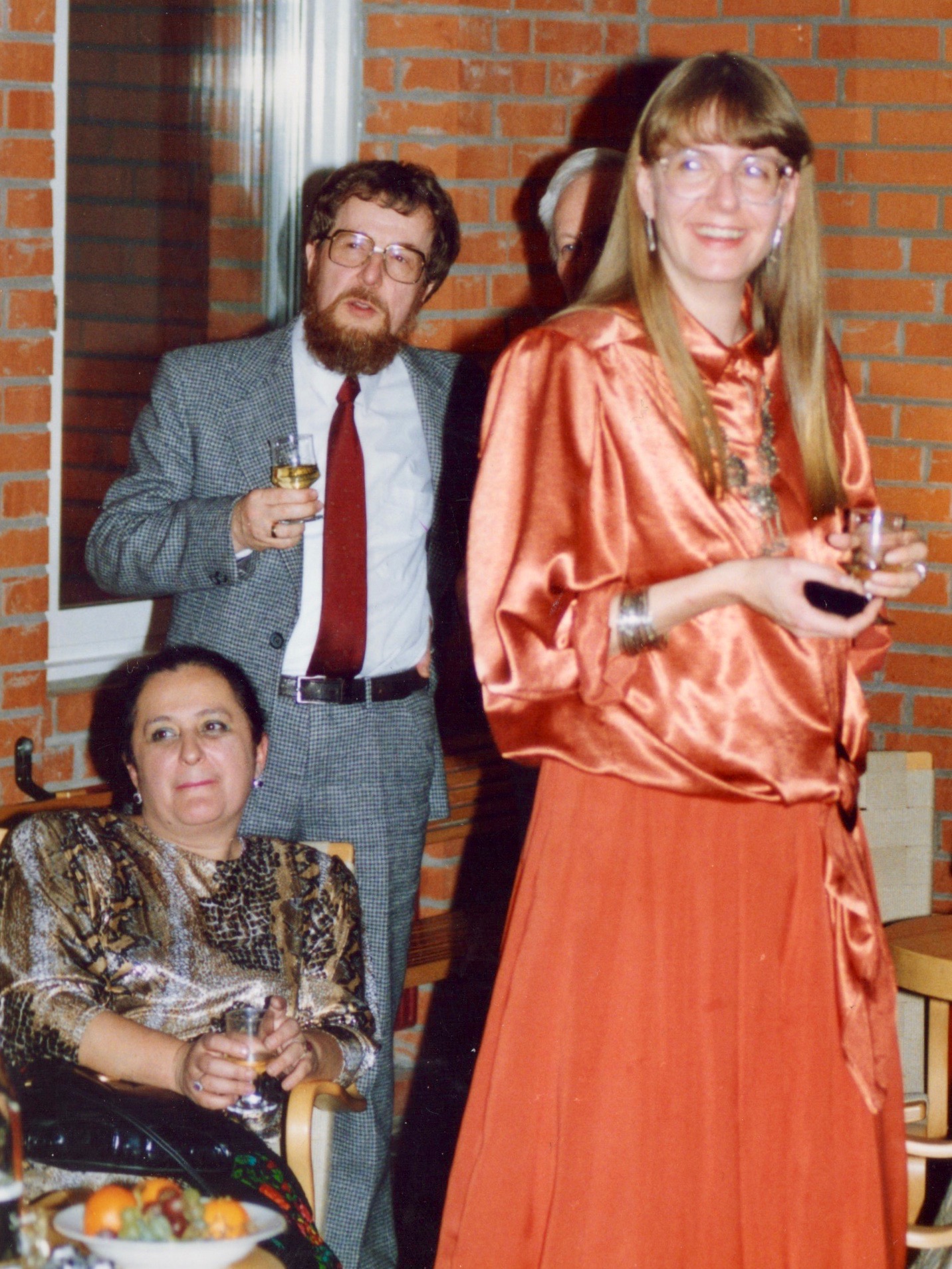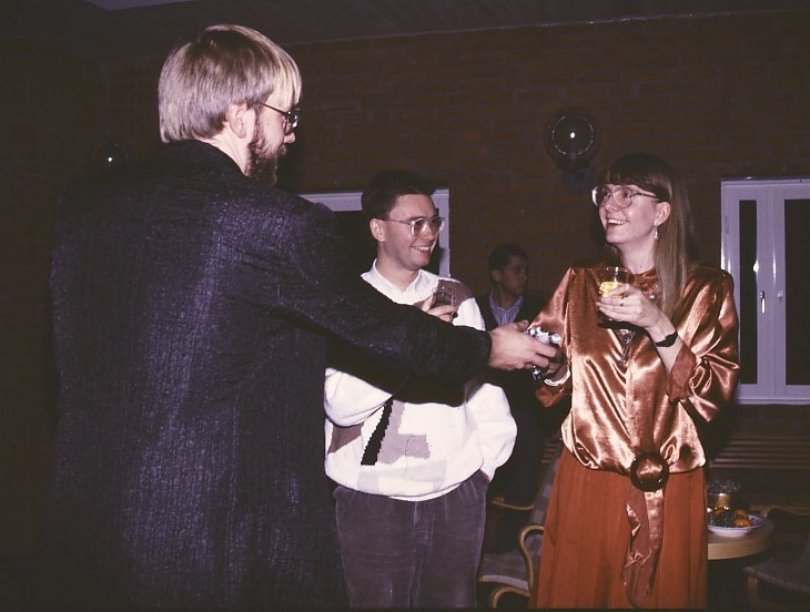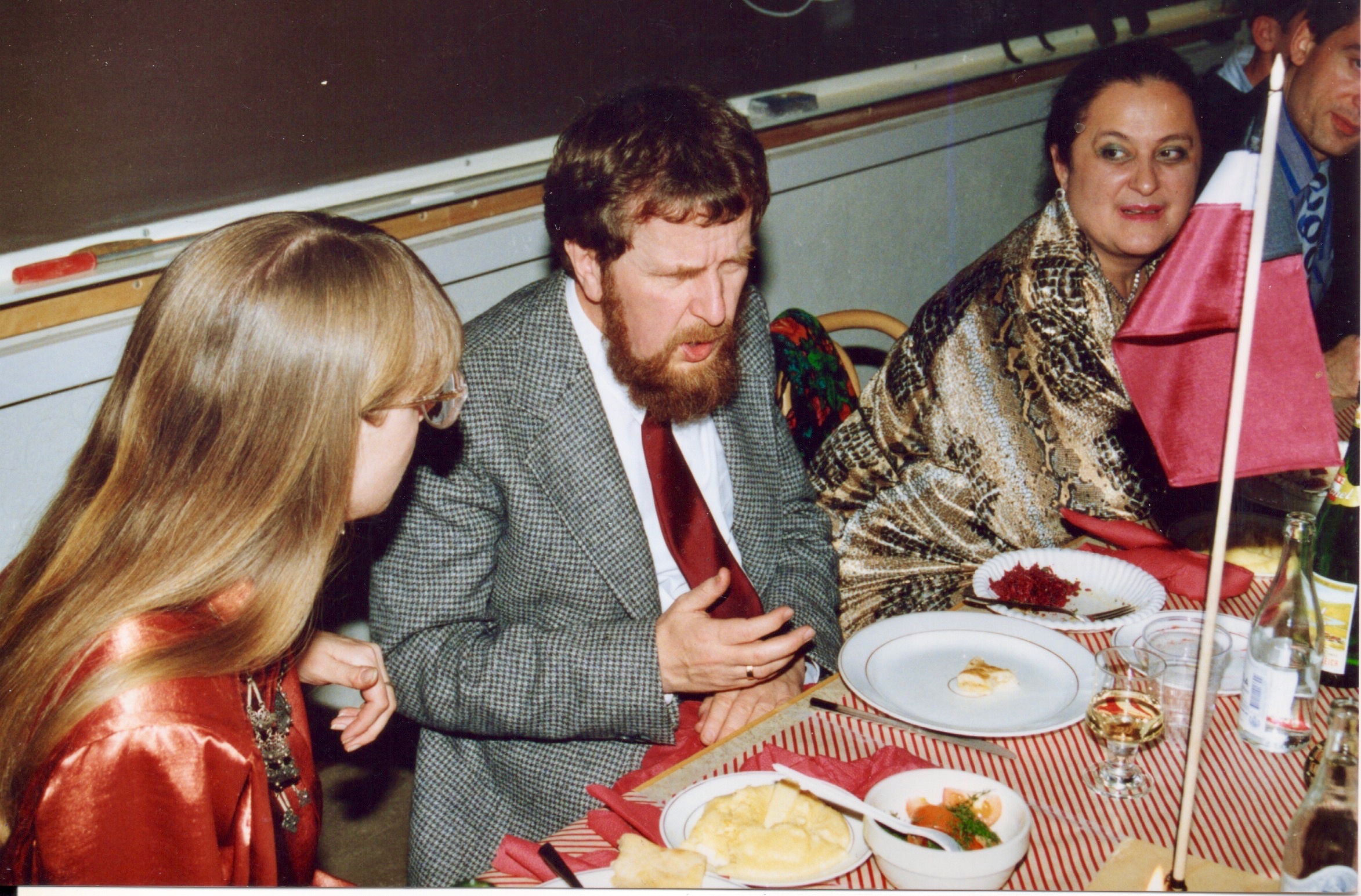 As this was long before smart phone days, no video recording remains. Some photos were made during the performance of the band Stämbandet, of Irakli K. playing the guitar and from the dissertation supra with guruli katami, ghomi, badridzhani nigvzit (thanks to Nani), churchkhela… The tables were decorated with flags of independent Georgia (made by my mother for the occasion), something that was quite unusual in 1989, as this was still during Soviet times.